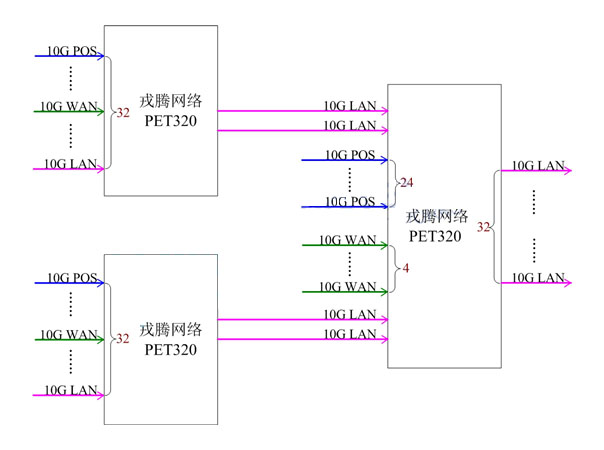 這讓用戶的選擇余地更多,如果只有1-2對鏈路,可以使用PET160配置一塊子卡。如果鏈路比較多,可以選擇PET320滿配。超過PET320鏈路容量時,可以使用PET設備串接。如圖4所示,3臺PET320B可以實現92個接口流量的輸入,最大容量達到920Gbps。如果繼續擴展,可以增加更多的輸入接口,且其輸入鏈路類型可以各不相同。這顯著地增加了系統的可擴展性,保護了用戶的投資。