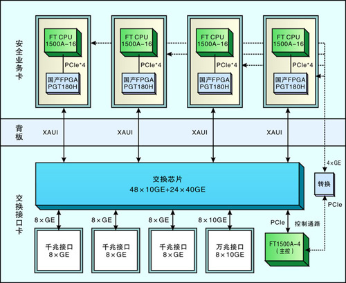 ACH-Platform 1.0是一個由兩塊板卡組成的網(wǎng)絡(luò)安全平臺,其中控制平面采用基于FT-1500A/4芯片的CPU卡,數(shù)據(jù)平面采用國產(chǎn)交換芯片和4塊FT-1500A/16芯片的CPU卡并行工作,CPU與交換芯片互聯(lián)采用紫光同創(chuàng)PGT180H,運(yùn)行麒麟4.0.2版本。
