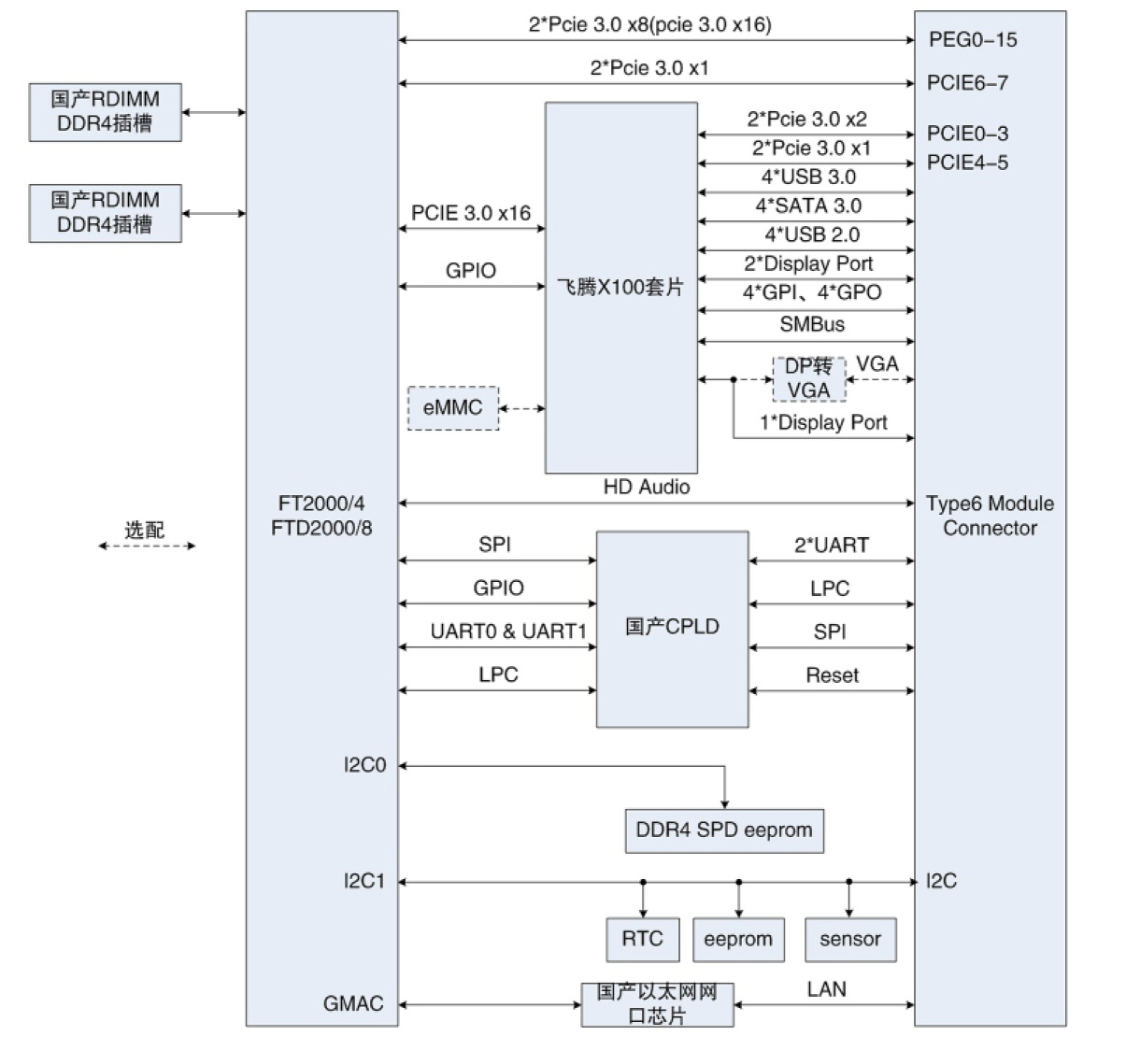 CME2000-T6模塊采用一顆國產飛騰騰銳D2000 八核高性能通用處理器(兼容FT2000/4 四核處理器),是一款基于COM Express Type6模塊標準設計實現的高性能全國產COMe Type6計算模塊,可應用于通信、工控、科研等領域。板載雙通道SODMIM DDR4內存插槽(支持ECC),結合飛騰X100套片,對外提供豐富的接口:4路SATA 3.0接口、2路PCIE 3.0 X8、2路PCIE 3.0 X2、4路PCIE 3.0 X1、4路USB 3.0、3路Display Port顯示(其中1路支持選配為VGA出)、1路千兆以太網、2路串口、LPC、I2C、SMBus、GPIO等,此外還支持選配自帶eMMC。