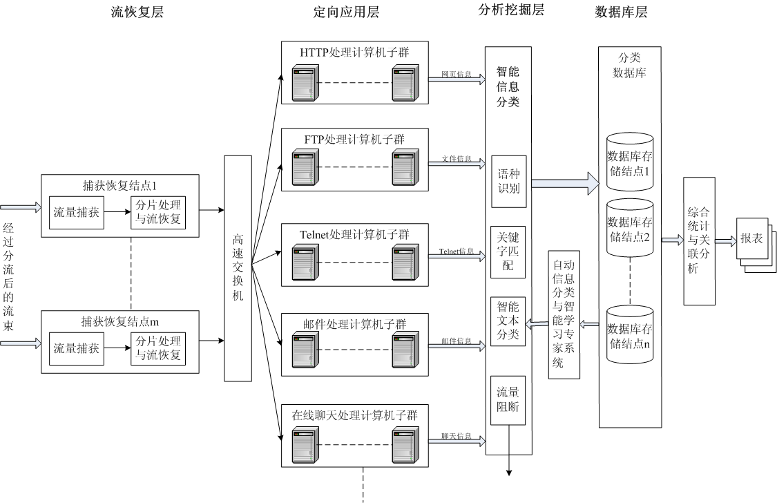 后端系統根據不同的需求可以采用不同的結構,但整體上由流恢復層、定向應用層、分析挖掘層和數據庫層共四部分組成。無論面向何種應用,在當前互聯網流量急劇增加的情況下,都需要前端設備有效衰減流量,降低后端服務器的計算和能耗。