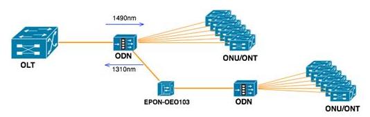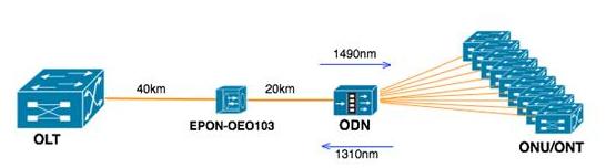 如圖1.1、圖1.2所示的EPON-OEO應用場景示意圖。其中,圖1.1是延距用法,即將中繼器串聯至OLT和ODN之間,延長距離可達60(40+20)Km,不包含中繼器與ODN之間衰減(20dB)